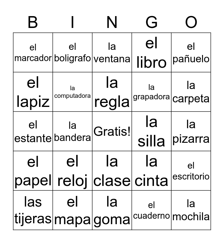 This bingo card has a free space and 24 words: el reloj, el mapa, la regla, las tijeras, el pañuelo, el marcador, el lapiz, el boligrafo, la silla, la clase, la grapadora, el estante, la cinta, el escritorio, la computadora, el cuaderno, la pizarra, la ventana, la carpeta, la bandera, la mochila, el papel, el libro and la goma.