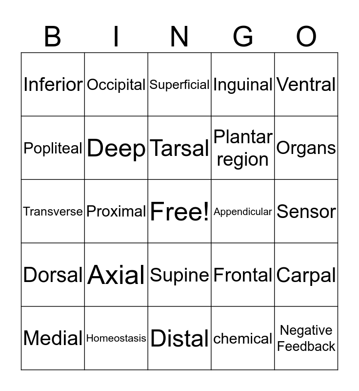 This bingo card has a free space and 29 words: Medial, Anterior, Proximal, Superior, Inferior, Superficial, Deep, Axial, Appendicular, Homeostasis, Sensor, Negative Feedback, Distal, chemical, Organs, Prone, Supine, Dorsal, Ventral, Transverse, Frontal, Midsagittal, Plantar region, Popliteal, Inguinal, Occipital, Carpal, Tarsal and Organism.