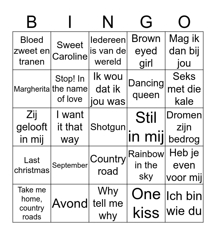 This bingo card has 25 words: Last christmas, Avond, Shotgun, One kiss, Mag ik dan bij jou, Bloed zweet en tranen, Sweet Caroline, Iedereen is van de wereld, Stil in mij, Heb je even voor mij, Margherita, Stop! In the name of love, Why tell me why, Rainbow in the sky, Seks met die kale, Take me home, country roads, I want it that way, Ik wou dat ik jou was, Dancing queen, Dromen zijn bedrog, Zij gelooft in mij, September, Country road, Brown eyed girl and Ich bin wie du.
