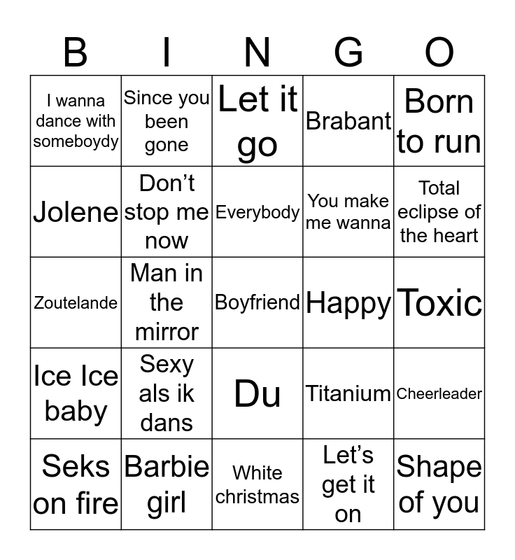This bingo card has 25 words: Ice Ice baby, Barbie girl, Boyfriend, Let’s get it on, Born to run, I wanna dance with someboydy, Since you been gone, Let it go, Happy, Cheerleader, Jolene, Don’t stop me now, White christmas, Titanium, Total eclipse of the heart, Seks on fire, Man in the mirror, Everybody, You make me wanna, Toxic, Zoutelande, Sexy als ik dans, Du, Brabant and Shape of you.