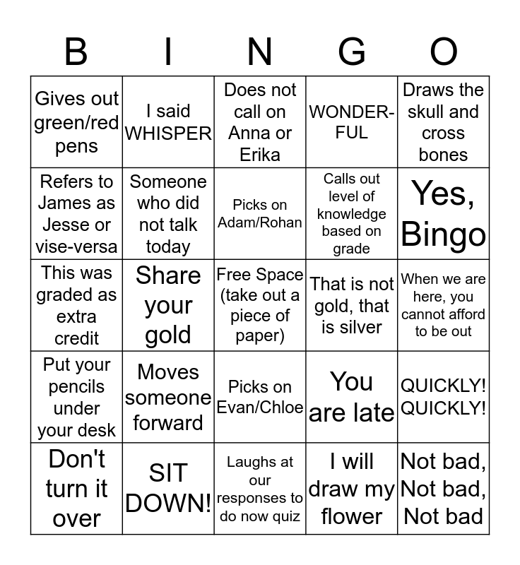 This bingo card has a free space and 24 words: Moves someone forward, SIT DOWN!, Picks on Adam/Rohan, Don't turn it over, Draws the skull and cross bones, Gives out green/red pens, Refers to James as Jesse or vise-versa, I said WHISPER, That is not gold, that is silver, Picks on Evan/Chloe, Calls out level of knowledge based on grade, This was graded as extra credit, You are late, QUICKLY! QUICKLY!, Someone who did not talk today, I will draw my flower, When we are here, you cannot afford to be out, Does not call on Anna or Erika, Yes, Bingo, Share your gold, Not bad, Not bad, Not bad, Put your pencils under your desk, WONDER-FUL and Laughs at our responses to do now quiz.