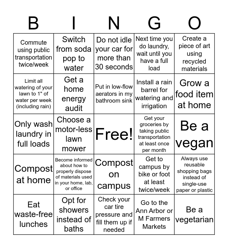 This bingo card has a free space and 31 words: Check your car tire pressure and fill them up if needed, Carpool to work at least once every week, Choose a motor-less lawn mower, Close blinds to keep the sun out when it is hot, Commute using public transportation twice/week, Do not idle your car for more than 30 seconds, Get a home energy audit, Get to campus by bike or foot at least twice/week, Get your groceries by taking public transportation at least once per month, Go to the Ann Arbor or M Farmers Markets, Be a vegan, Be a vegetarian, Go meatless one day of every week (try Meatless Monday!), Go to a local farmers market at least once/month, Grow a food item at home, Host a meatless cookout, Always use reusable shopping bags instead of single-use paper or plastic, Become informed about how to properly dispose of materials used in your home, lab, or office, Compost at home, Compost on campus, Create a piece of art using recycled materials, Eat a waste-free lunch 2 days next week, Eat waste-free lunches, Switch from soda pop to water, Install a rain barrel for watering and irrigation, Limit all watering of your lawn to 1" of water per week (including rain), Next time you do laundry, wait until you have a full load, Only wash laundry in full loads, Opt for showers instead of baths, Put in low-flow aerators in my bathroom sink and Re-use towels and wear jeans more than once in order to reduce laundry.