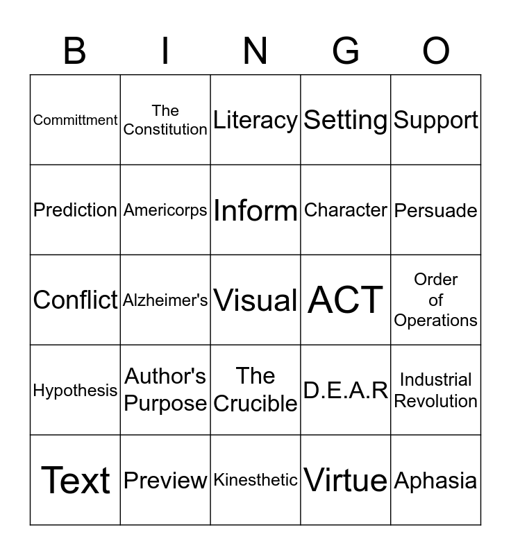 This bingo card has a free space and 24 words: Author's Purpose, Preview, Inform, Text, Support, Committment, Prediction, The Constitution, ACT, The Crucible, Character, Conflict, D.E.A.R, Industrial Revolution, Americorps, Virtue, Order of Operations, Literacy, Persuade, Alzheimer's, Aphasia, Hypothesis, Setting and Kinesthetic.