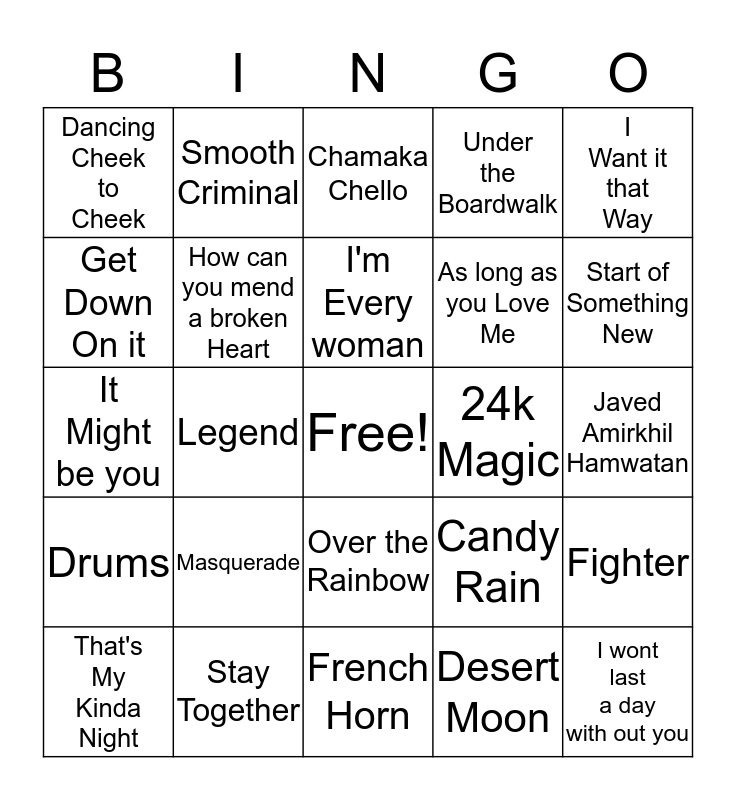 This bingo card has a free space and 24 words: Masquerade, Stay Together, I'm Every woman, That's My Kinda Night, I Want it that Way, Dancing Cheek to Cheek, Get Down On it, Smooth Criminal, 24k Magic, Over the Rainbow, As long as you Love Me, It Might be you, Candy Rain, Fighter, How can you mend a broken Heart, Desert Moon, Javed Amirkhil Hamwatan, Chamaka Chello, Start of Something New, Legend, I wont last a day with out you, Drums, Under the Boardwalk and French Horn.
