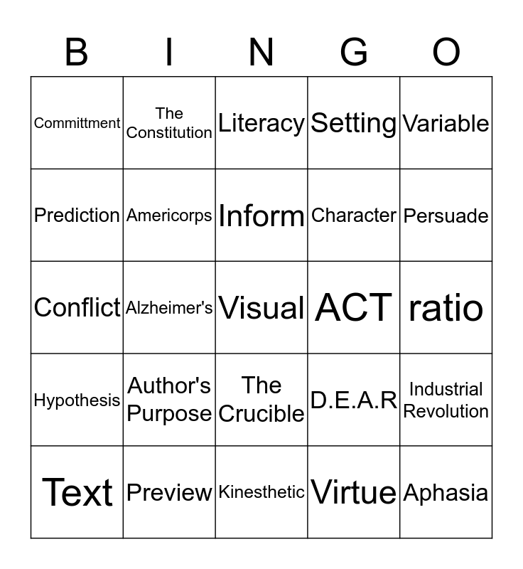 This bingo card has a free space and 24 words: Author's Purpose, Preview, Inform, Text, Variable, Committment, Prediction, The Constitution, ACT, The Crucible, Character, Conflict, D.E.A.R, Industrial Revolution, Americorps, Virtue, ratio, Literacy, Persuade, Alzheimer's, Aphasia, Hypothesis, Setting and Kinesthetic.