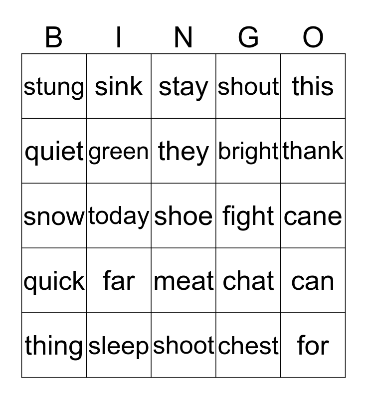 This bingo card has 25 words: quick, sleep, shoe, chest, this, stung, sink, stay, fight, can, quiet, green, shoot, chat, thank, thing, today, they, bright, cane, snow, far, meat, shout and for.