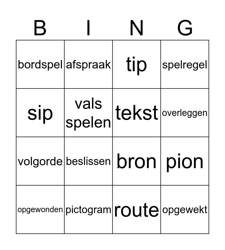 This bingo card has 16 words: pictogram, pion, tip, bordspel, volgorde, afspraak, bron, route, sip, vals spelen, opgewonden, spelregel, beslissen, overleggen, tekst and opgewekt.
