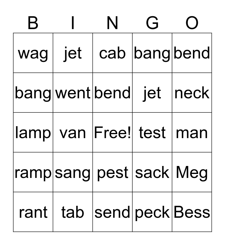 ⚠ This card has duplicate items: van (2), cap (2), cab (2), bag (2), Jack (2), ant (2), sang (2), tank (2), lamp (2), beg (2), mess (2), send (2), went (2), test (2), neck (2), wag (2), rant (4), bang (2), rank (2), camp (2), egg (2), jet (2), Bess (2), bend (2), tent (2), west (2), deck (2), man (2), tab (2), rag (2), less (2), pest (2), peck (2), mend (2), Kent (2), sack (2), sank (2), ramp (2), Meg (2), wet (2)