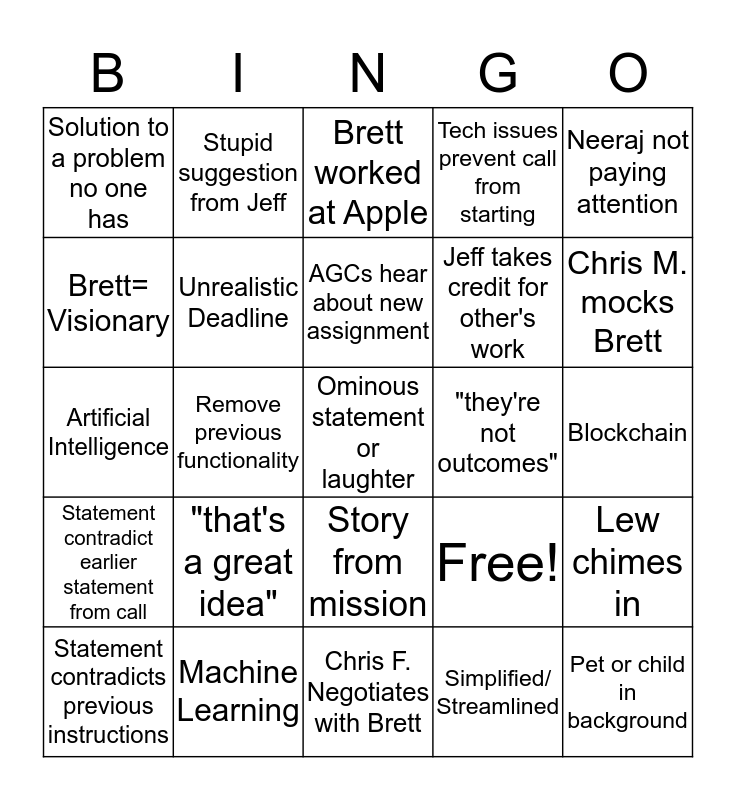 This bingo card has 25 words: "that's a great idea", Chris F. Negotiates with Brett, AGCs hear about new assignment, Statement contradicts previous instructions, Neeraj not paying attention, Solution to a problem no one has, Brett= Visionary, Stupid suggestion from Jeff, "they're not outcomes", Story from mission, Jeff takes credit for other's work, Artificial Intelligence, Free!, Lew chimes in, Unrealistic Deadline, Pet or child in background, Blockchain, Brett worked at Apple, Chris M. mocks Brett, Remove previous functionality, Ominous statement or laughter, Machine Learning, Statement contradict earlier statement from call, Tech issues prevent call from starting and Simplified/ Streamlined.