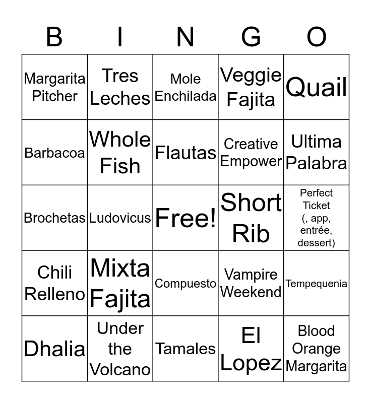 This bingo card has a free space and 24 words: Mixta Fajita, Under the Volcano, Flautas, Dhalia, Quail, Margarita Pitcher, Barbacoa, Tres Leches, Short Rib, Compuesto, Creative Empower, Brochetas, Vampire Weekend, Tempequenia, Whole Fish, El Lopez, Perfect Ticket (, app, entrée, dessert), Mole Enchilada, Ultima Palabra, Ludovicus, Blood Orange Margarita, Chili Relleno, Veggie Fajita and Tamales.