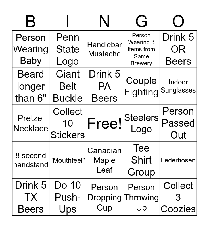 This bingo card has a free space and 24 words: "Mouthfeel", Do 10 Push-Ups, Drink 5 PA Beers, Drink 5 TX Beers, Drink 5 OR Beers, Person Wearing Baby, Beard longer than 6", Penn State Logo, Steelers Logo, Canadian Maple Leaf, Couple Fighting, Pretzel Necklace, Tee Shirt Group, Lederhosen, Giant Belt Buckle, Person Throwing Up, Person Passed Out, Handlebar Mustache, Indoor Sunglasses, Collect 10 Stickers, Collect 3 Coozies, 8 second handstand, Person Wearing 3 Items from Same Brewery and Person Dropping Cup.