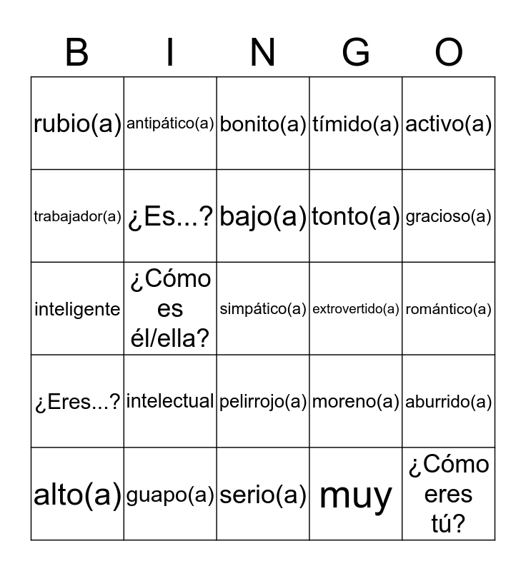 Adjetivo Bingo | Question words Interrogatives | Spanish Adjectives | Spanish bingo | Español 1 Vocab. 1B