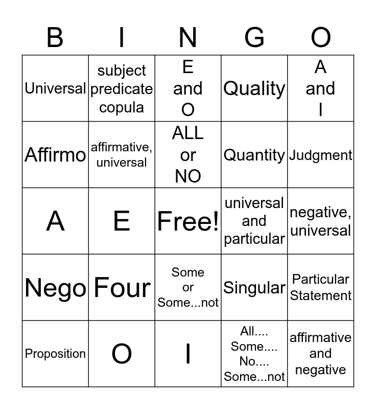 This bingo card has a free space and 24 words: Four, O, ALL or NO, Proposition, A and I, Universal, Affirmo, subject predicate copula, universal and particular, Some or Some...not, Quantity, A, Singular, Particular Statement, affirmative, universal, All.... Some.... No.... Some...not, negative, universal, E and O, Judgment, E, affirmative and negative, Nego, Quality and I.