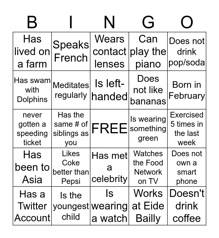 This bingo card has a free space and 24 words: Likes Coke better than Pepsi, Is the youngest child, Is left-handed, Has a Twitter Account, Does not drink pop/soda, Has lived on a farm, Has swam with Dolphins, Speaks French, Is wearing something green, Has met a celebrity, Does not like bananas, never gotten a speeding ticket, Watches the Food Network on TV, Does not own a smart phone, Meditates regularly, Works at Eide Bailly, Exercised 5 times in the last week, Wears contact lenses, Born in February, Has the same # of siblings as you, Doesn't drink coffee, Has been to Asia, Can play the piano and Is wearing a watch.