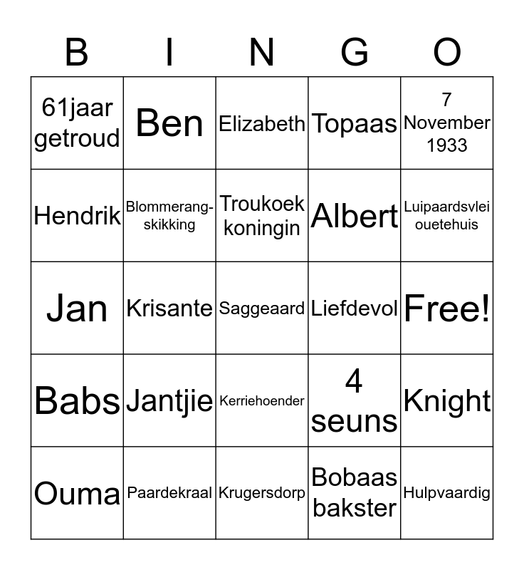 This bingo card has a free space and 24 words: Jantjie, Paardekraal, Troukoek koningin, Ouma, 7 November 1933, 61jaar getroud, Hendrik, Ben, Liefdevol, Kerriehoender, Albert, Jan, 4 seuns, Knight, Blommerang- skikking, Bobaas bakster, Free!, Elizabeth, Luipaardsvlei ouetehuis, Krisante, Hulpvaardig, Babs, Topaas and Krugersdorp.