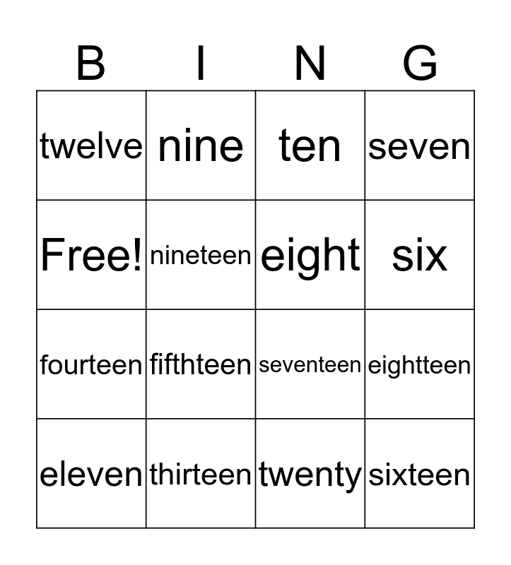 This bingo card has 16 words: thirteen, eightteen, ten, twelve, fourteen, nine, seventeen, twenty, Free!, nineteen, eleven, seven, fifthteen, six, eight and sixteen.