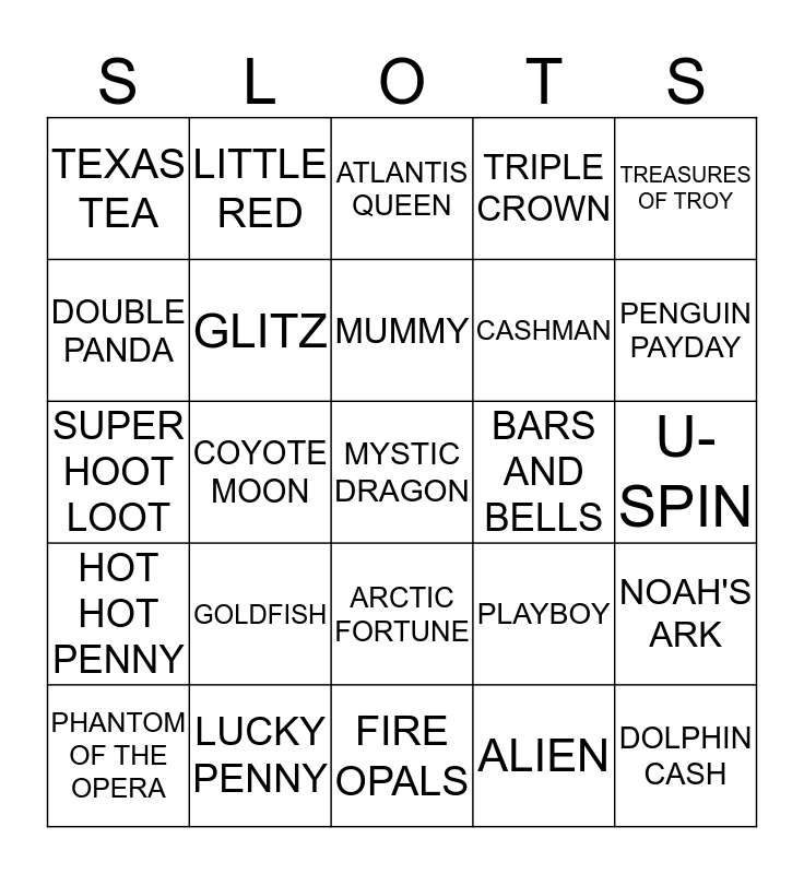This bingo card has a free space and 24 words: GOLDFISH, LUCKY PENNY, MUMMY, PHANTOM OF THE OPERA, TREASURES OF TROY, TEXAS TEA, DOUBLE PANDA, LITTLE RED, BARS AND BELLS, ARCTIC FORTUNE, CASHMAN, SUPER HOOT LOOT, PLAYBOY, NOAH'S ARK, GLITZ, ALIEN, U-SPIN, ATLANTIS QUEEN, PENGUIN PAYDAY, COYOTE MOON, DOLPHIN CASH, HOT HOT PENNY, TRIPLE CROWN and FIRE OPALS.