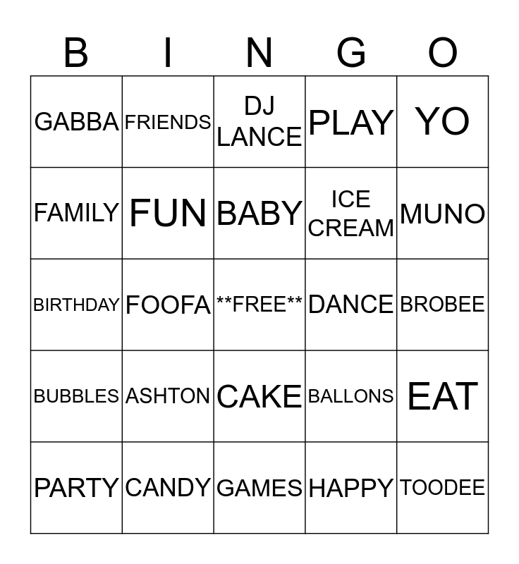 This bingo card has a free space and 24 words: ASHTON, CANDY, BABY, PARTY, YO, GABBA, FAMILY, FRIENDS, DANCE, CAKE, ICE CREAM, BIRTHDAY, BALLONS, EAT, FUN, HAPPY, BROBEE, DJ LANCE, MUNO, FOOFA, TOODEE, BUBBLES, PLAY and GAMES.