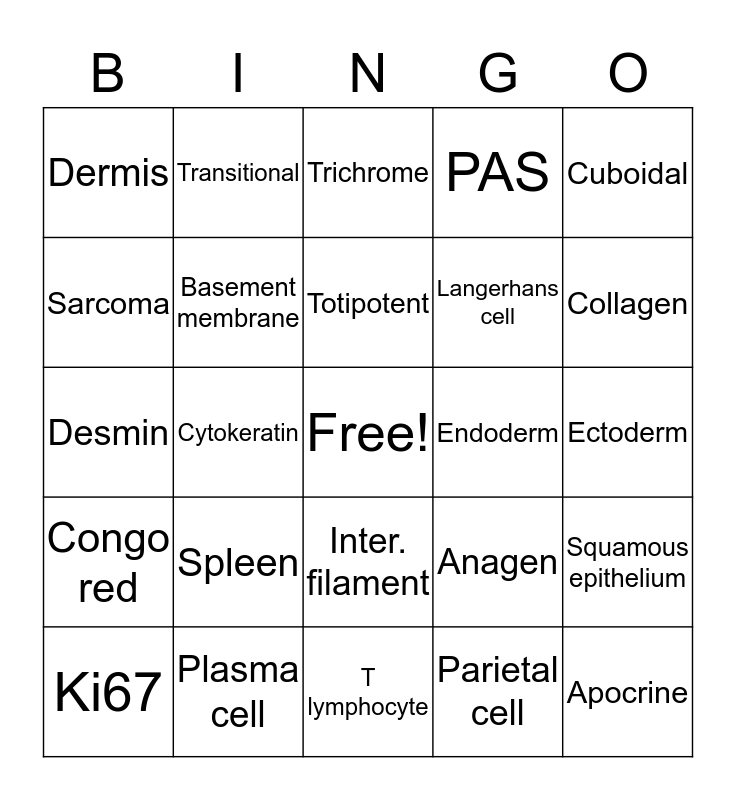 This bingo card has a free space and 24 words: Spleen, Plasma cell, Totipotent, Ki67, Cuboidal, Dermis, Sarcoma, Transitional, Endoderm, Inter. filament, Langerhans cell, Desmin, Anagen, Squamous epithelium, Basement membrane, Parietal cell, Ectoderm, Trichrome, Collagen, Cytokeratin, Apocrine, Congo red, PAS and T lymphocyte.