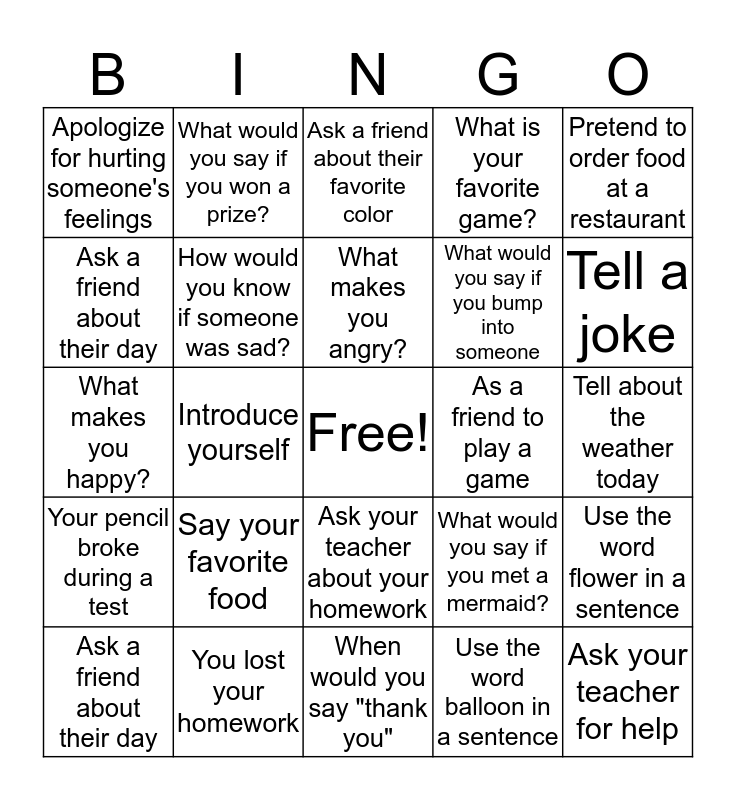 This bingo card has a free space and 24 words: Ask a friend about their day, Say your favorite food, What makes you angry?, Use the word balloon in a sentence, Pretend to order food at a restaurant, Apologize for hurting someone's feelings, What would you say if you won a prize?, Ask a friend about their favorite color, As a friend to play a game, Tell about the weather today, What makes you happy?, How would you know if someone was sad?, What would you say if you met a mermaid?, Use the word flower in a sentence, Ask a friend about their day, You lost your homework, When would you say "thank you", What is your favorite game?, Tell a joke, Your pencil broke during a test, Introduce yourself, Ask your teacher about your homework, What would you say if you bump into someone and Ask your teacher for help.