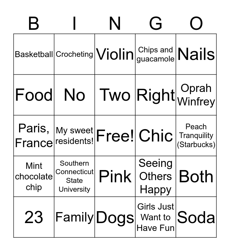 This bingo card has a free space and 24 words: Southern Connecticut State University, Family, Two, 23, Nails, Basketball, Food, Crocheting, Chic, Pink, Right, Paris, France, Seeing Others Happy, Both, No, Girls Just Want to Have Fun, Peach Tranquility (Starbucks), Violin, Oprah Winfrey, My sweet residents!, Soda, Mint chocolate chip, Chips and guacamole and Dogs.