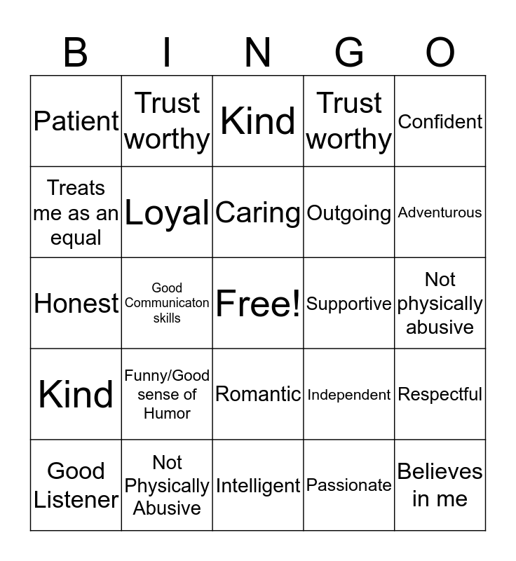 This bingo card has a free space and 24 words: Funny/Good sense of Humor, Not Physically Abusive, Caring, Good Listener, Confident, Patient, Treats me as an equal, Trust worthy, Supportive, Romantic, Outgoing, Honest, Independent, Respectful, Loyal, Passionate, Not physically abusive, Kind, Adventurous, Good Communicaton skills, Believes in me, Kind, Trust worthy and Intelligent.