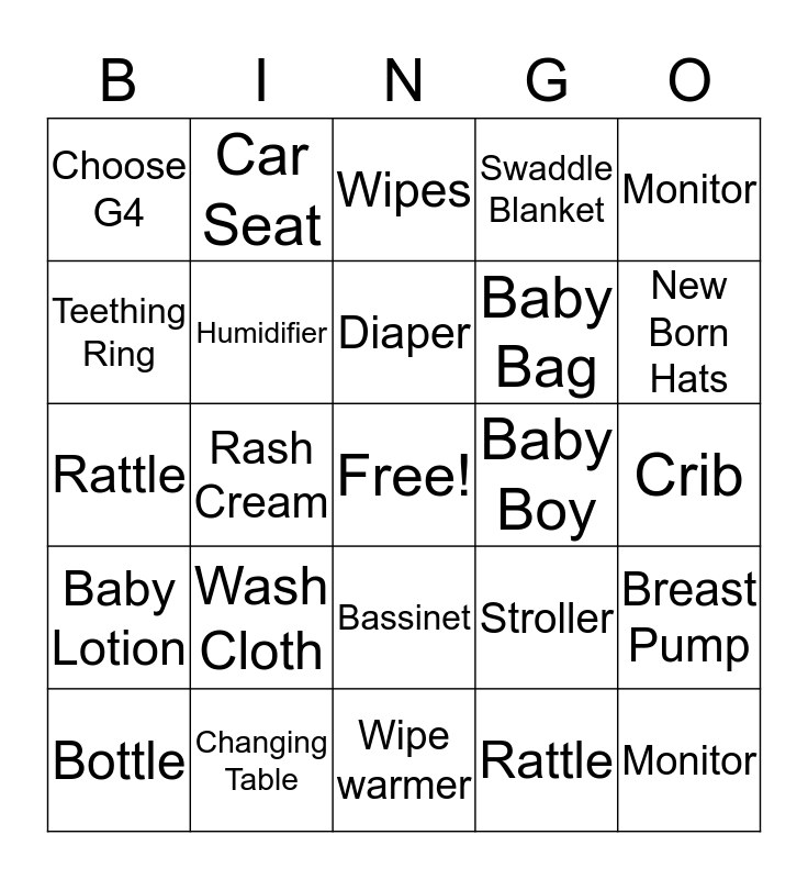 This bingo card has a free space and 24 words: Bottle, Wash Cloth, Diaper, Rattle, Monitor, Choose G4, Car Seat, Wipes, Baby Boy, Crib, Rattle, Humidifier, Stroller, Breast Pump, Teething Ring, Changing Table, Wipe warmer, Swaddle Blanket, New Born Hats, Baby Lotion, Rash Cream, Bassinet, Baby Bag and Monitor.