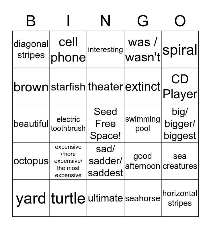 This bingo card has a free space and 59 words: dolphin, turtle, anchor, octopus, seahorse, seal, starfish, shell, extinct, were / weren't, was / wasn't, small, brown, orange, vertical stripes, diagonal stripes, horizontal stripes, spiral, spots, theater, swimming pool, interesting, yard, sea creatures, ocean, beaches, gadget, walkie-talkie, CD Player, rivers, usually, elevator, flashlight / torch, MP3 Player, cell phone, electric fan, laptop, electric toothbrush, game console, beautiful, problem, expensive /more expensive/ the most expensive, big/ bigger/ biggest, fast/ faster/ fastest, sun and rain, happy/ happier/ happiest, easy/ easier/ easiest, small/ smaller/ smallest, sad/ sadder/ saddest, ultimate, adventure, kit, North Africa, invented, good morning, good afternoon, parents, sometimes and always.