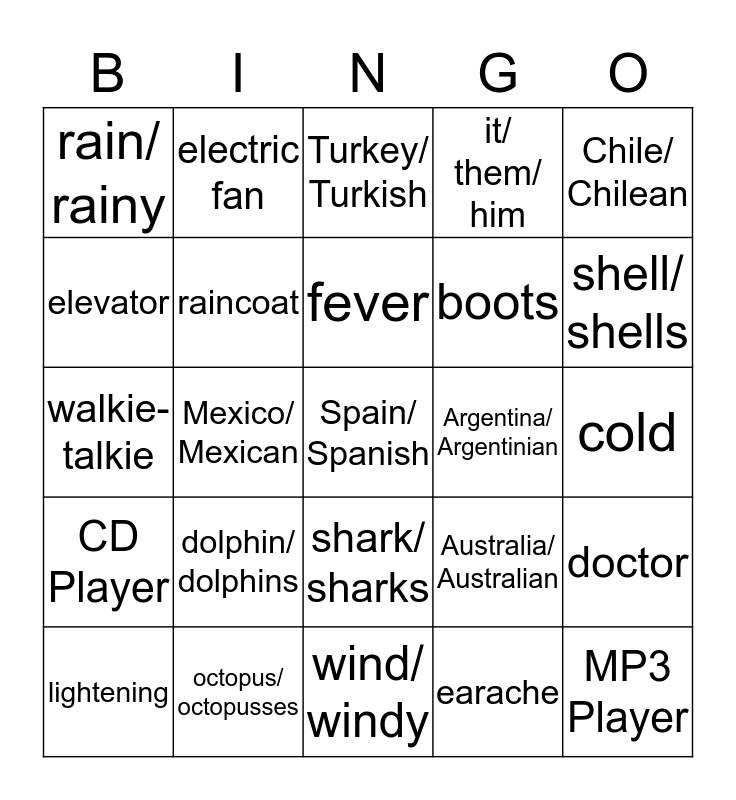 This bingo card has 55 words: thunderstorm, lightening, cloud/ cloudy, rain/ rainy, wind/ windy, umbrella, raincoat, fog/ foggy, boots, are/ is/ am, it/ them/ him, tall/ taller/ tallest, Seed Free Space!, behind/ next/ front, by/ on/ of, Egypt/ Egyptian, Chile/ Chilean, Mexico/ Mexican, China/ Chinese, Spain/ Spanish, Argentina/ Argentinian, India/ Indian, Australia/ Australian, Turkey/ Turkish, Brazil/ Brazilian, fever, earache, headache, cold, doctor, toothache, nurse, stomachache, cough, elevator, walkie-talkie, flashlight, CD Player, MP3 Player, cell phone, electric fan, laptop, electric toothbrush, game console, dolphin/ dolphins, octopus/ octopusses, seahorse/ seahorses, seal/ seals, starfish/ 2 starfishes or 2 starfish, shell/ shells, anchor, turtle, baiji/ baijis, shark/ sharks and escape.