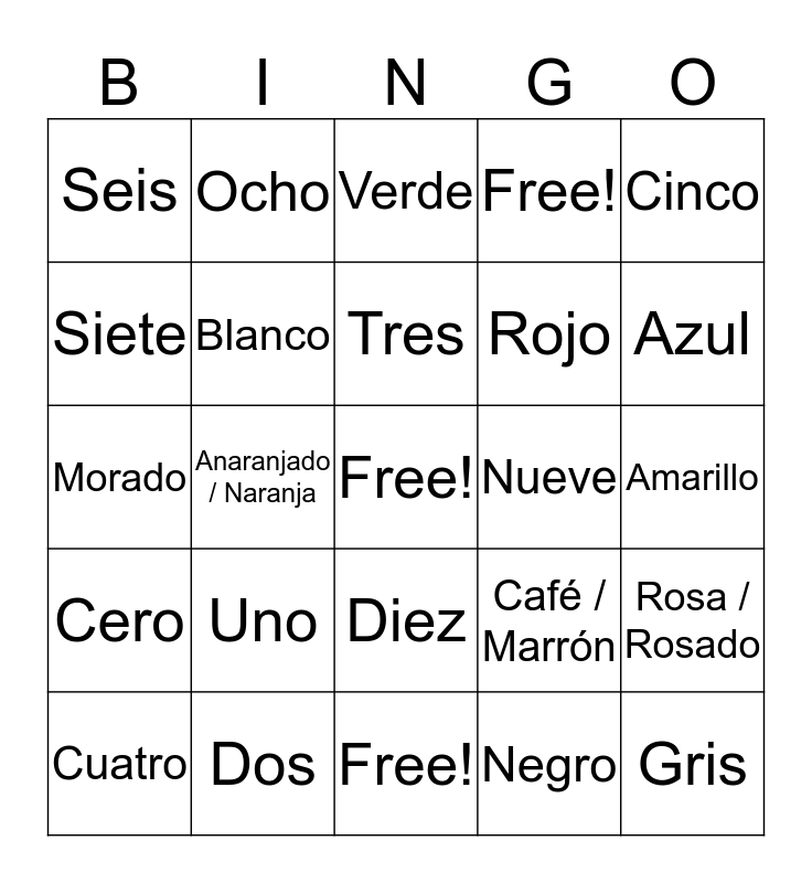 This bingo card has a free space and 24 words: Uno, Dos, Tres, Cuatro, Cinco, Seis, Siete, Ocho, Nueve, Diez, Rojo, Morado, Café / Marrón, Rosa / Rosado, Blanco, Negro, Amarillo, Verde, Azul, Anaranjado / Naranja, Gris, Cero, Free! and Free!.