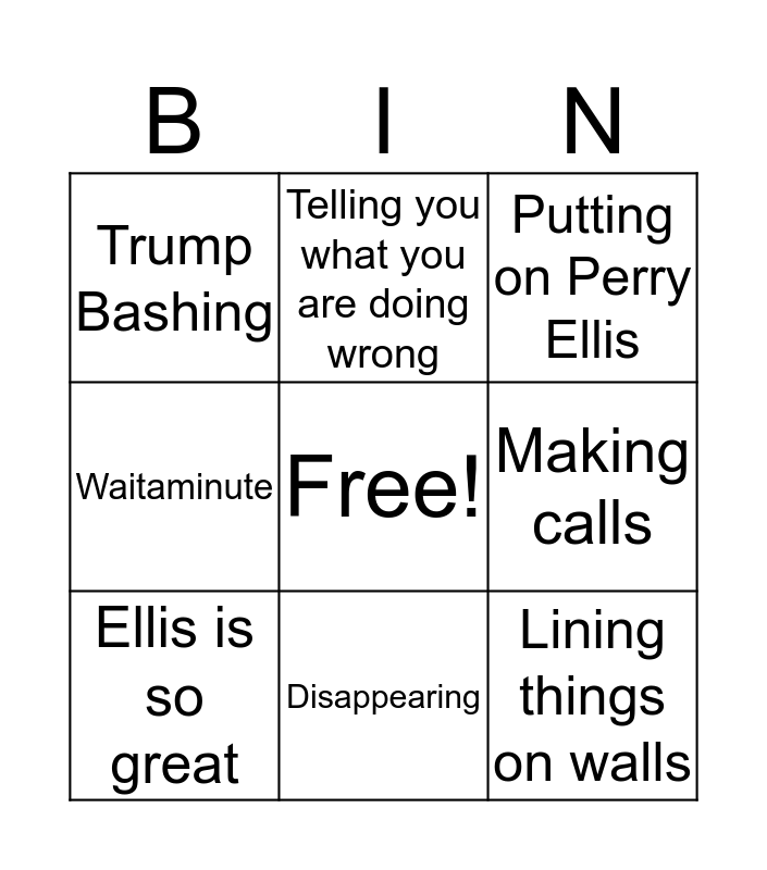 This bingo card has a free space and 8 words: Making calls, Putting on Perry Ellis, Telling you what you are doing wrong, Ellis is so great, Trump Bashing, Lining things on walls, Waitaminute and Disappearing.