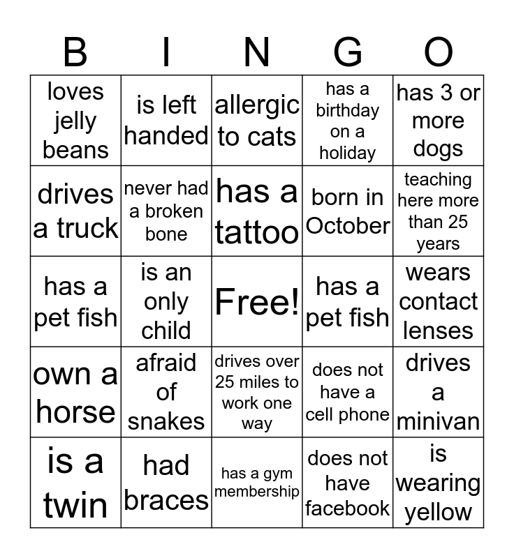 This bingo card has a free space and 24 words: is a twin, afraid of snakes, has a tattoo, does not have facebook, has 3 or more dogs, loves jelly beans, is left handed, allergic to cats, has a pet fish, wears contact lenses, has a pet fish, never had a broken bone, does not have a cell phone, drives a minivan, drives a truck, had braces, has a gym membership, has a birthday on a holiday, teaching here more than 25 years, own a horse, is an only child, drives over 25 miles to work one way, born in October and is wearing yellow.