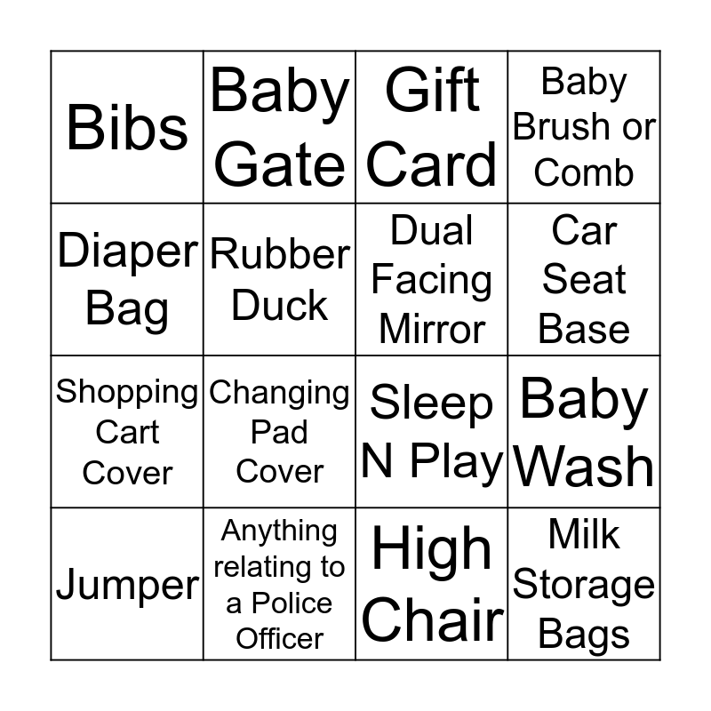This bingo card has 16 words: Anything relating to a Police Officer, Baby Wash, Gift Card, Bibs, Shopping Cart Cover, Baby Gate, Sleep N Play, High Chair, Diaper Bag, Rubber Duck, Jumper, Baby Brush or Comb, Changing Pad Cover, Car Seat Base, Dual Facing Mirror and Milk Storage Bags.