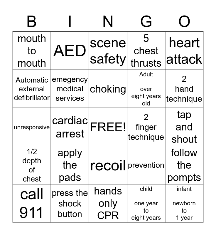 This bingo card has a free space and 24 words: call 911, apply the pads, choking, child one year to eight years, heart attack, mouth to mouth, AED, scene safety, 2 finger technique, tap and shout, unresponsive, emegency medical services, prevention, follow the pompts, Automatic external defibrillator, press the shock button, hands only CPR, 5 chest thrusts, 2 hand technique, 1/2 depth of chest, cardiac arrest, recoil, Adult over eight years old and infant newborn to 1 year.