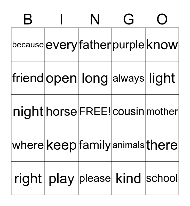 This bingo card has a free space and 24 words: keep, play, long, right, know, because, friend, every, cousin, family, always, night, animals, there, open, kind, mother, father, light, horse, school, where, purple and please.
