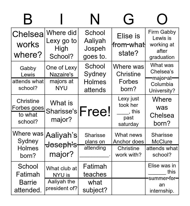 This bingo card has 13 images, a free space and 23 words: Aaliyah’s Joseph's major?, What club at NYU is Aaliyah the president of?, School Sydney Holmes attends, School Fatimah Barrie attended., Firm Gabby Lewis is working at after graduation, Chelsea works where?, Gabby Lewis attends what school?, Where did Lexy go to High School?, Lexy just took her ____, this past saturday, Sharisse plans on attending __________., Where was Christine Forbes born?, Christine Forbes goes to what school?, What news Anchor does Christine work with?, Sharisse McClure attends what school?, One of Lexy Nazaire's majors at NYU, Where was Chelsea born?, School Aaliyah Jospeh goes to., What was Chelsea’s major at Columbia University?, What is Sharisse's major?, Elise was in ______ this summer for an internship., Where was Sydney Holmes born?, Elise is from what state? and Fatimah teaches what subject?.