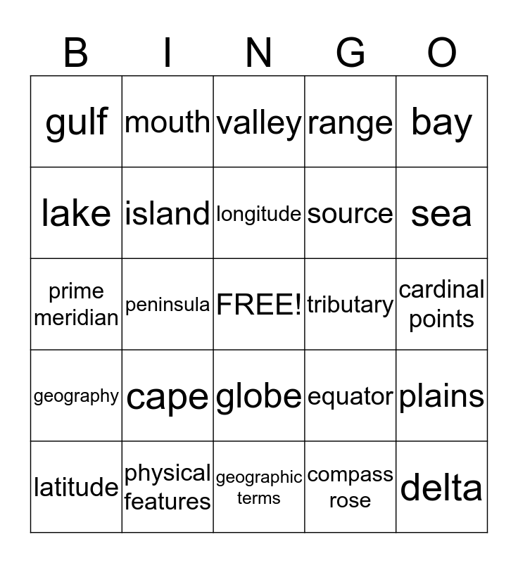 This bingo card has a free space and 24 words: cape, physical features, longitude, latitude, bay, gulf, lake, mouth, tributary, globe, source, prime meridian, equator, plains, island, compass rose, cardinal points, valley, sea, peninsula, delta, geography, range and geographic terms.