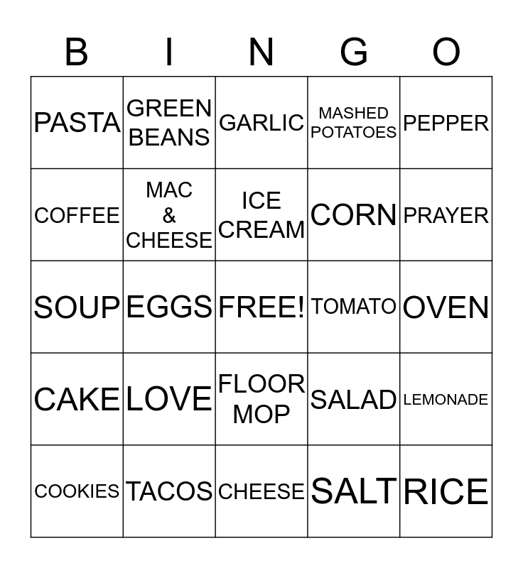 This bingo card has a free space and 24 words: LOVE, TACOS, ICE CREAM, COOKIES, PEPPER, PASTA, COFFEE, GREEN BEANS, TOMATO, FLOOR MOP, CORN, SOUP, SALAD, LEMONADE, MAC & CHEESE, SALT, OVEN, GARLIC, PRAYER, EGGS, RICE, CAKE, MASHED POTATOES and CHEESE.