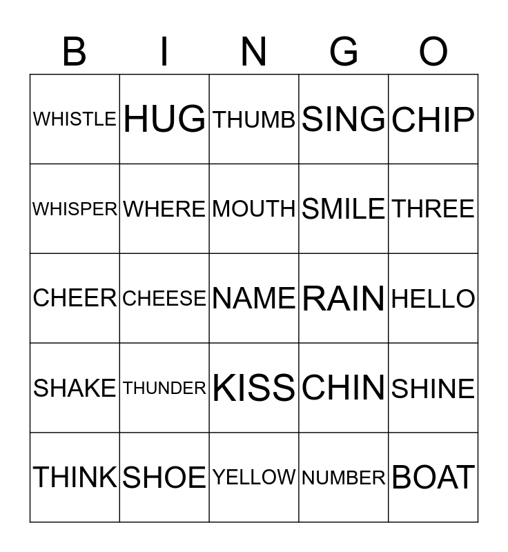 This bingo card has 25 words: THUNDER, YELLOW, MOUTH, THINK, CHIP, WHISTLE, WHISPER, HUG, RAIN, KISS, SMILE, CHEER, CHIN, SHINE, WHERE, BOAT, HELLO, THUMB, THREE, CHEESE, NAME, SHOE, SHAKE, SING and NUMBER.