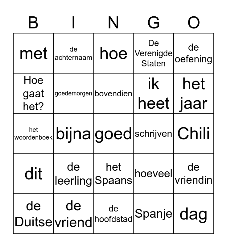 This bingo card has 25 words: de leerling, de hoofdstad, bovendien, de Duitse, de oefening, met, Hoe gaat het?, de achternaam, schrijven, het Spaans, ik heet, het woordenboek, hoeveel, de vriendin, goedemorgen, dag, Chili, hoe, het jaar, bijna, goed, de vriend, dit, De Verenigde Staten and Spanje.