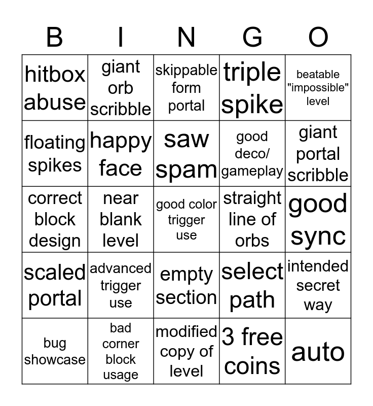 This bingo card has a free space and 24 words: advanced trigger use, bad corner block usage, saw spam, bug showcase, beatable "impossible" level, hitbox abuse, floating spikes, giant orb scribble, straight line of orbs, empty section, good deco/ gameplay, correct block design, select path, intended secret way, happy face, 3 free coins, good sync, skippable form portal, giant portal scribble, near blank level, auto, scaled portal, triple spike and modified copy of level.