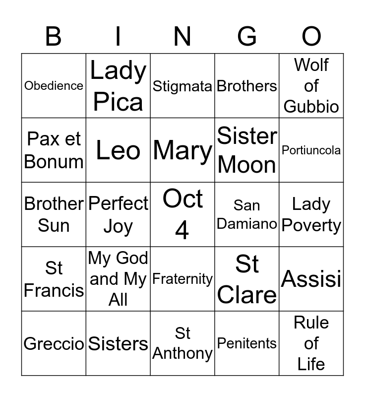 This bingo card has a free space and 24 words: Greccio, My God and My All, Mary, Penitents, Wolf of Gubbio, Obedience, Lady Pica, Stigmata, San Damiano, Lady Poverty, Brother Sun, Leo, St Clare, Assisi, Pax et Bonum, Sisters, St Anthony, Brothers, Portiuncola, St Francis, Perfect Joy, Fraternity, Sister Moon and Rule of Life.