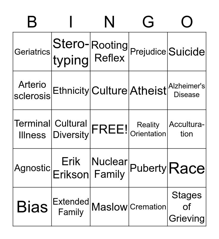 This bingo card has a free space and 24 words: Erik Erikson, Extended Family, Culture, Bias, Suicide, Geriatrics, Arterio sclerosis, Stero- typing, Reality Orientation, Nuclear Family, Atheist, Terminal Illness, Puberty, Race, Ethnicity, Cremation, Accultura- tion, Rooting Reflex, Alzheimer's Disease, Cultural Diversity, Stages of Grieving, Agnostic, Prejudice and Maslow.