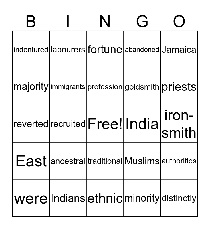 This bingo card has a free space and 25 words: East, Indians, ethnic, minority, Jamaica, indentured, labourers, fortune, India, authorities, majority, immigrants, Hindus, Muslims, priests, were, recruited, profession, goldsmith, iron-smith, reverted, ancestral, traditional, abandoned and distinctly.