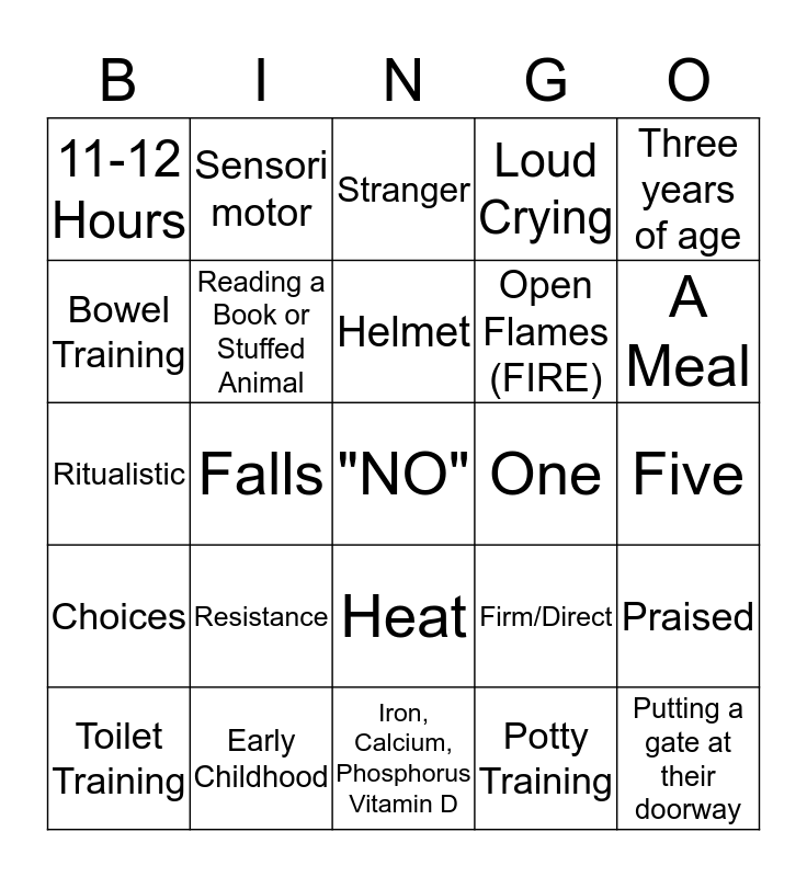 This bingo card has 25 words: Resistance, Iron, Calcium, Phosphorus Vitamin D, Helmet, Toilet Training, Three years of age, 11-12 Hours, Bowel Training, Sensori motor, One, Heat, Open Flames (FIRE), Ritualistic, Firm/Direct, Praised, Reading a Book or Stuffed Animal, Putting a gate at their doorway, Five, Stranger, A Meal, Falls, "NO", Early Childhood, Choices, Loud Crying and Potty Training.