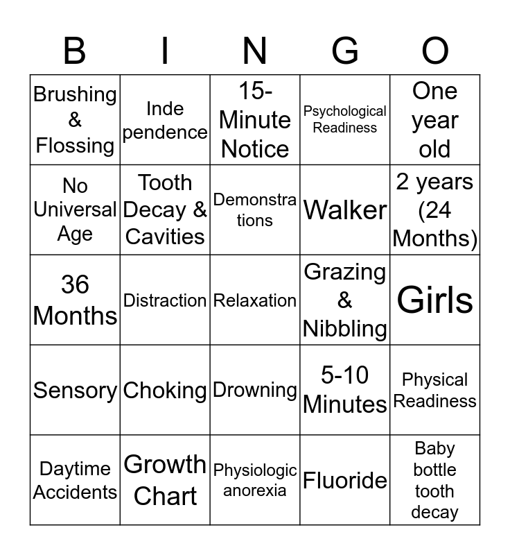 This bingo card has 25 words: Choking, Physiologic anorexia, Demonstra tions, Daytime Accidents, One year old, Brushing & Flossing, No Universal Age, Inde pendence, Grazing & Nibbling, Drowning, Walker, 36 Months, 5-10 Minutes, Physical Readiness, Tooth Decay & Cavities, Baby bottle tooth decay, Girls, 15-Minute Notice, 2 years (24 Months), Distraction, Relaxation, Growth Chart, Sensory, Psychological Readiness and Fluoride.