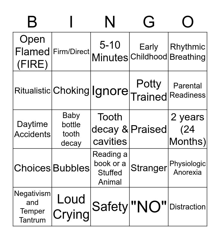 This bingo card has 25 words: Bubbles, Safety, Ignore, Negativism and Temper Tantrum, Rhythmic Breathing, Open Flamed (FIRE), Ritualistic, Firm/Direct, Praised, Reading a book or a Stuffed Animal, Potty Trained, Daytime Accidents, Stranger, Physiologic Anorexia, Choking, Distraction, 2 years (24 Months), 5-10 Minutes, Parental Readiness, Baby bottle tooth decay, Tooth decay & cavities, Loud Crying, Choices, Early Childhood and "NO".