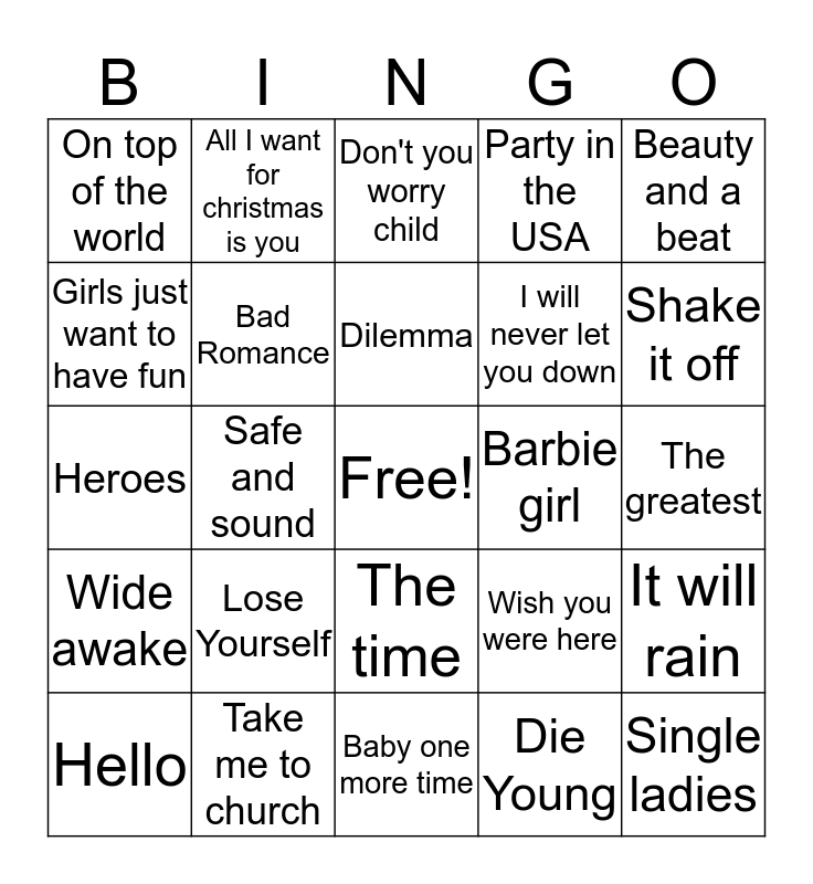 This bingo card has a free space and 47 words: Total eclipse of the heart, Single ladies, I will always love you, Baby one more time, Lose Yourself, Wannabe, All I want for christmas is you, Someone like you, Girls just want to have fun, Milshake, Bad Romance, Party in the USA, It will rain, Wish you were here, Bring me to life, Hollaback girl, Dilemma, Barbie girl, Tik tok, Beauty and a beat, Safe and sound, Die Young, On top of the world, I will never let you down, Honey i'm good, Shake it off, Hello, Diamonds, The time, Wide awake, Story of my life, Best day of my life, Blurred lines, When I was your man, Slow down, Take me to church, The greatest, I took a pill in ibiza, Stay with me, Adventure of a lifetime, Ain't your mama, Don't you worry child, Heroes, Paparazzi, Dynamite, Lights and Habits.