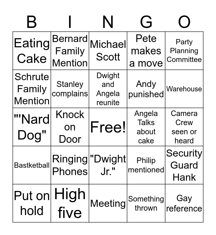 This bingo card has a free space and 25 words: Ringing Phones, Meeting, Dwight and Angela reunite, Put on hold, Party Planning Committee, Eating Cake, Schrute Family Mention, Bernard Family Mention, Angela Talks about cake, "Dwight Jr.", Andy punished, "'Nard Dog", Philip mentioned, Security Guard Hank, Stanley complains, Meredith red wig, Camera Crew seen or heard, Michael Scott, Warehouse, Knock on Door, Gay reference, High five, Bastketball, Pete makes a move and Something thrown.