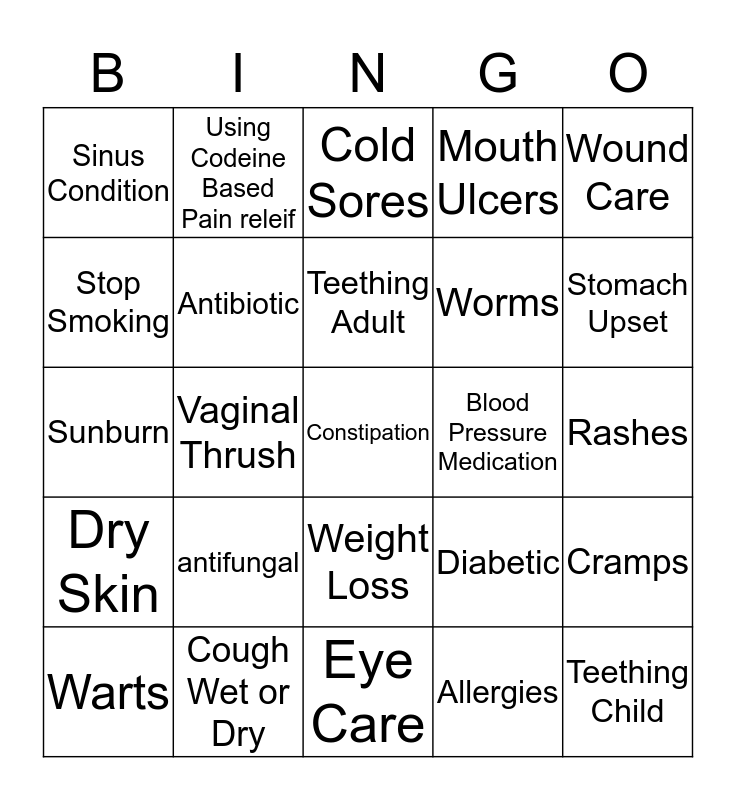 This bingo card has a free space and 24 words: antifungal, Cough Wet or Dry, Teething Adult, Warts, Wound Care, Sinus Condition, Stop Smoking, Using Codeine Based Pain releif, Blood Pressure Medication, Weight Loss, Worms, Sunburn, Diabetic, Cramps, Antibiotic, Allergies, Rashes, Cold Sores, Stomach Upset, Vaginal Thrush, Teething Child, Dry Skin, Mouth Ulcers and Eye Care.